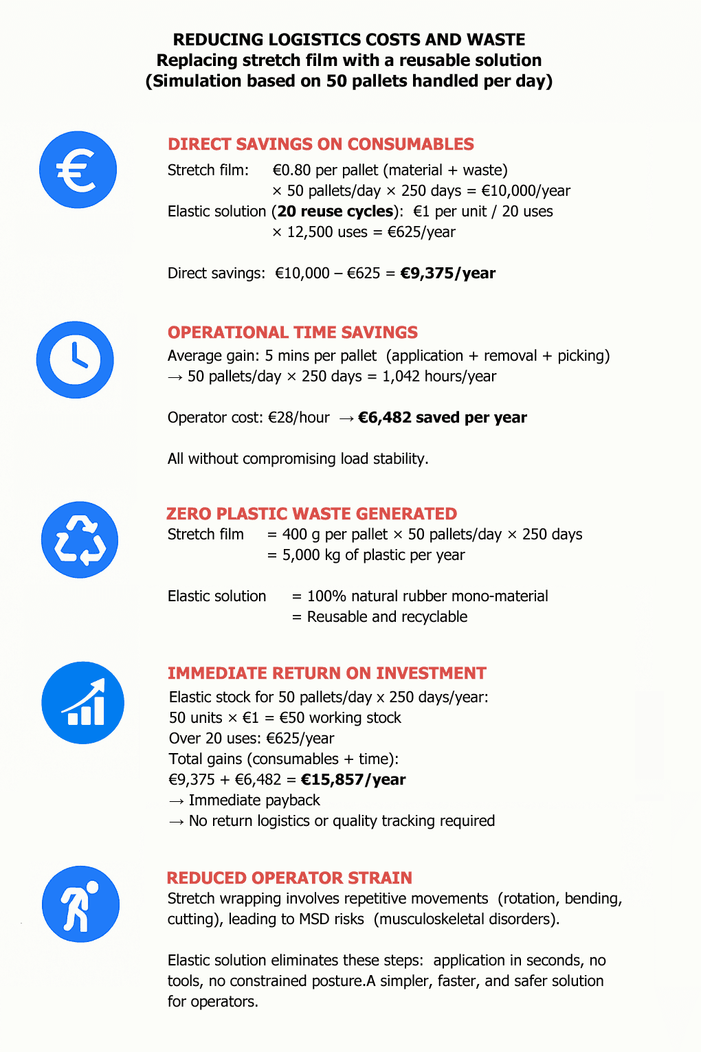 In a context of increasing regulatory pressure, QHSE objectives, and cost control, the pallet elastic offers a reusable solution that is simple to deploy and compatible with standard operations.
